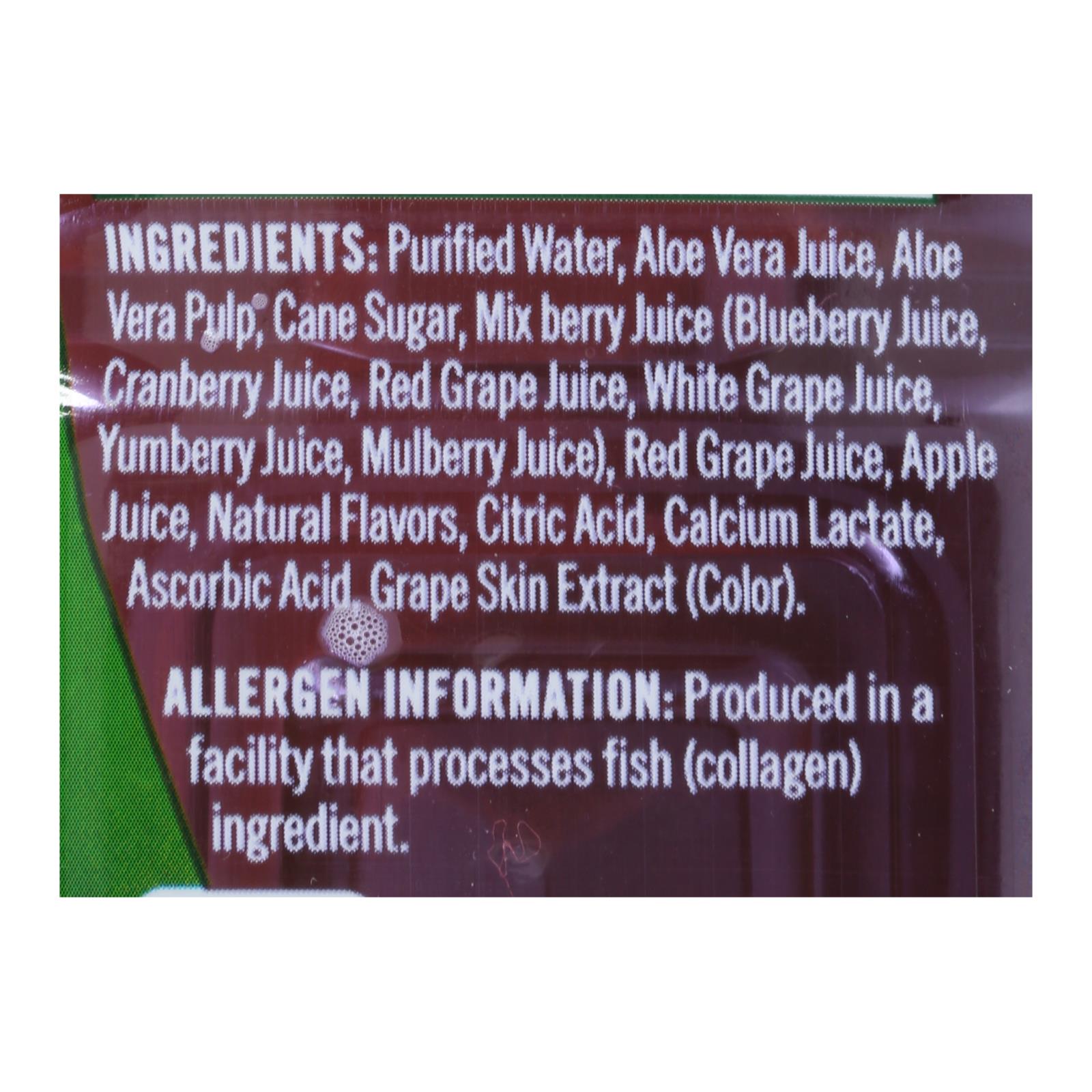 ingredients : purified water;aloe vera juice;aloe vera pulp;cane sugar;mix berry juice (blueberry juice, cranberry juice, red grape juice, white grape juice, yumberry juice, mulberry juice);red grape juice;apple juice;natural flavors;citric acid;calcium lactate;ascorbic acid;grape skin extract (color)