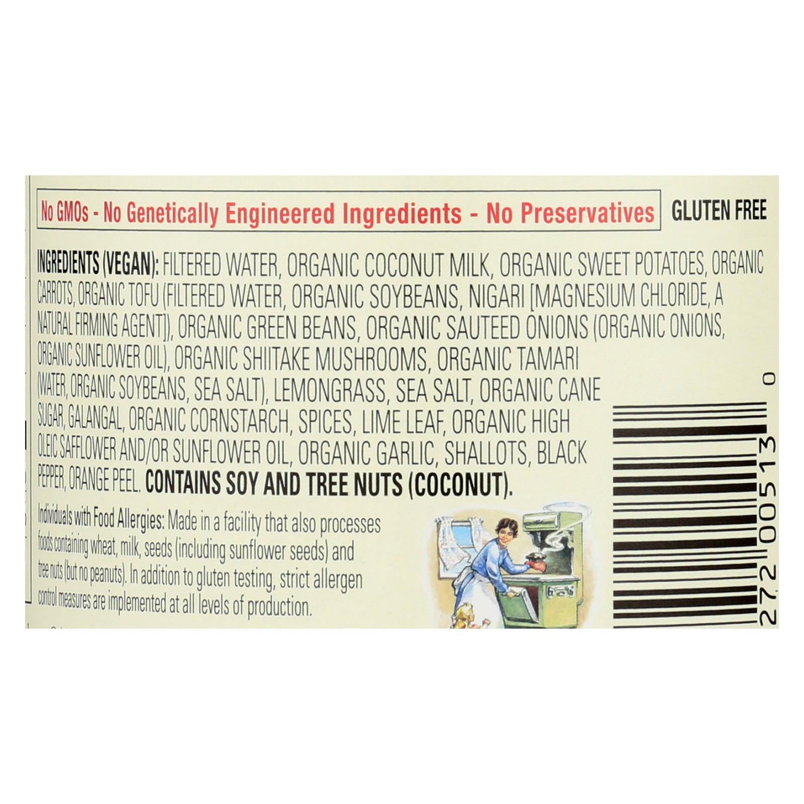ingredients : filtered water;organic coconut milk;organic sweet potatoes;organic carrots;organic tofu (filtered water, organic soybeans, nigari [magnesium chloride, a natural firming agent]);organic green beans;organic sauteed onions (organic onions, organic sunflower oil);organic shiitake mushrooms;organic tamari (water, organic soybeans, sea salt);lemongrass;sea salt;organic cane sugar;galangal;organic cornstarch;spices;lime leaf;organic high oleic safflower and/or sunflower oil;organic garlic;shallots;blac
