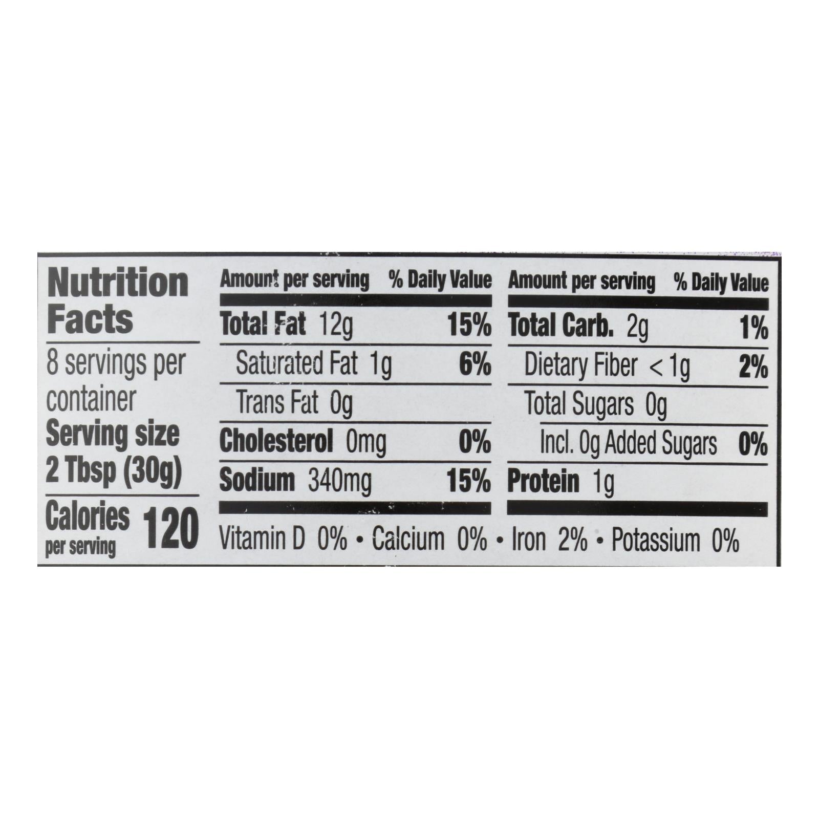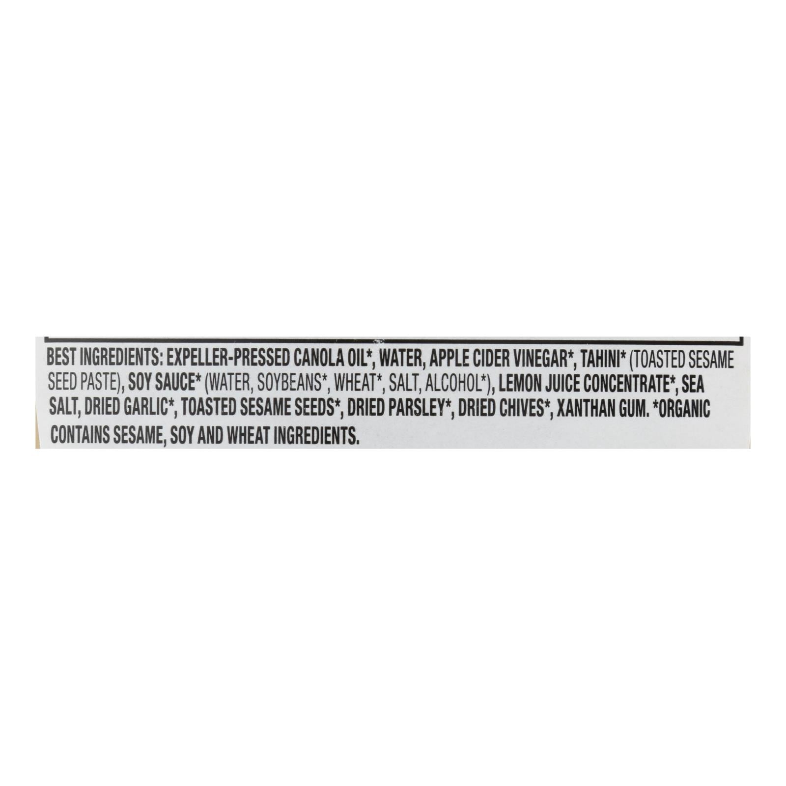 ingredients : expeller-pressed canola oil;water;apple cider vinegar;tahini* (toasted sesame seed paste);soy sauce* (water, soybeans*, wheat*, salt, alcohol*);lemon juice concentrate;sea salt;dried garlic;toasted sesame seeds;dried parsley;dried chives;xanthan gum