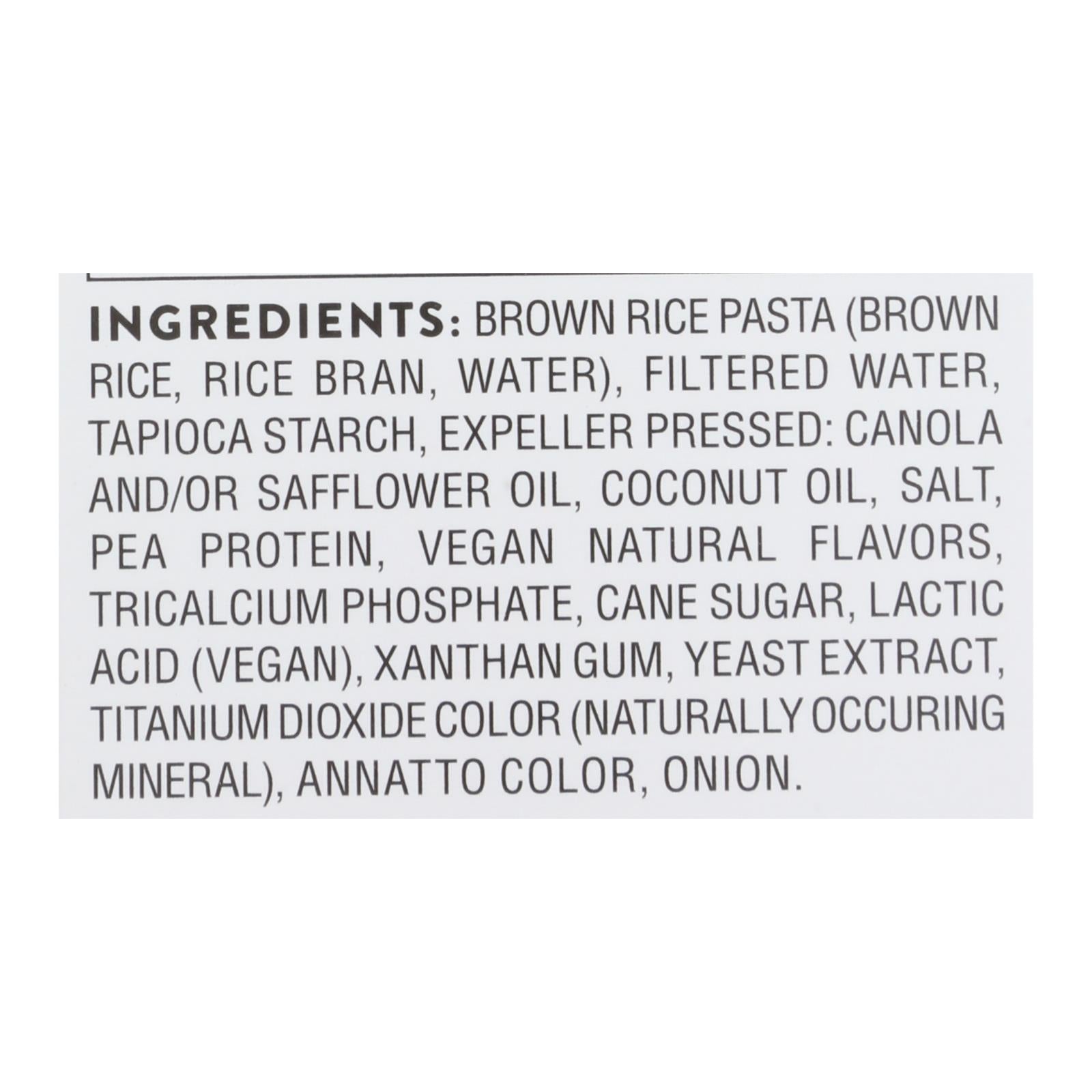 ingredients : rice pasta (white rice, brown rice);filtered water;coconut oil;expeller pressed safflower oil;oat flour;tapioca starch;less than 2% of: salt, pea protein, cane sugar, annatto (for color), onion, yeast extract, tricalcium phosphate, gum arabic, xanthan gum, lactic acid, natural flavors