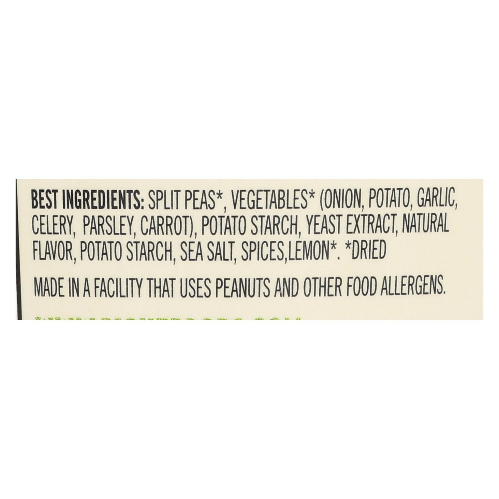 ingredients : split peas;vegetables* (onion, potato, garlic, celery, parsley, carrot);potato starch;yeast extract natural flavor;potato starch;sea salt;spices;lemon