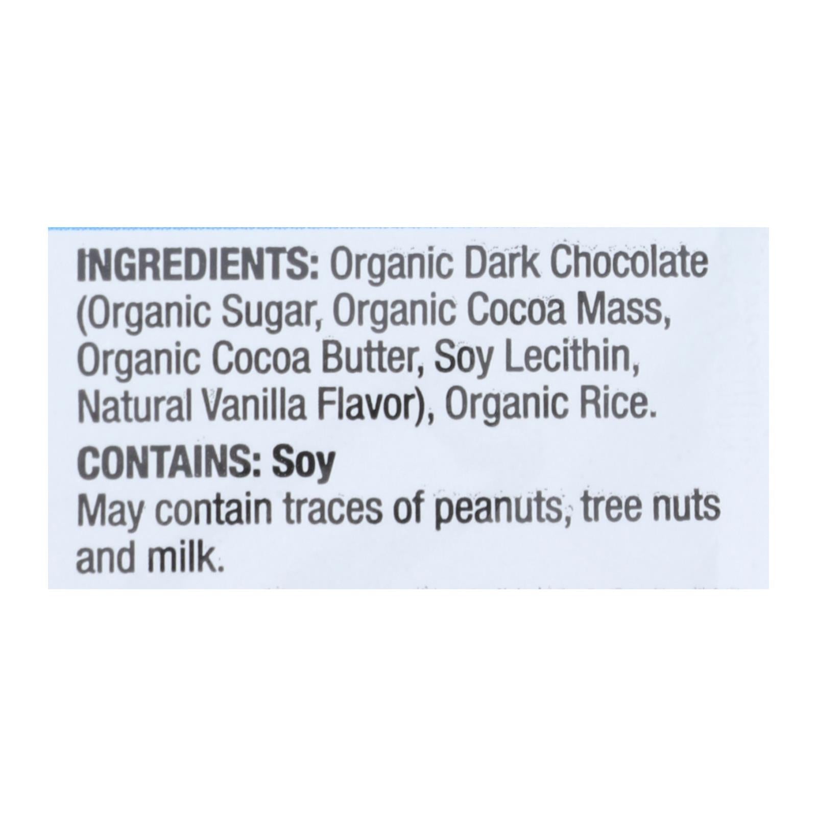 ingredients : organic dark chocolate (organic sugar, organic cocoa mass, organic cocoa butter, soy lecithin, natural vanilla flavor);organic rice