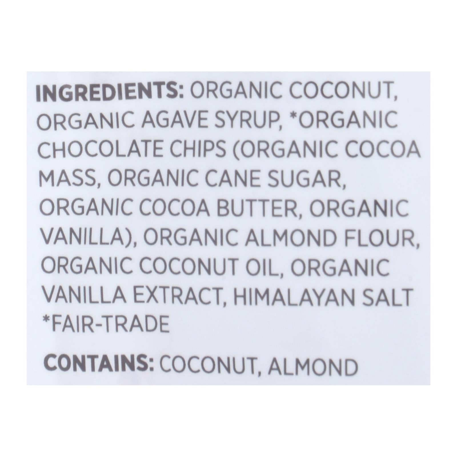 ingredients : organic coconut;organic agave syrup;organic chocolate chips;organic cocoa mass;organic cane sugar;organic cocoa butter;organic vanilla;organic almond flour;organic coconut oil;organic vanilla extract;himalayan salt