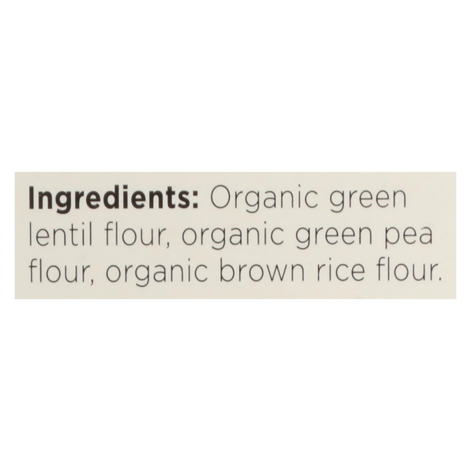 ingredients : organic green lentil flour;organic green pea flour;organic brown rice flour