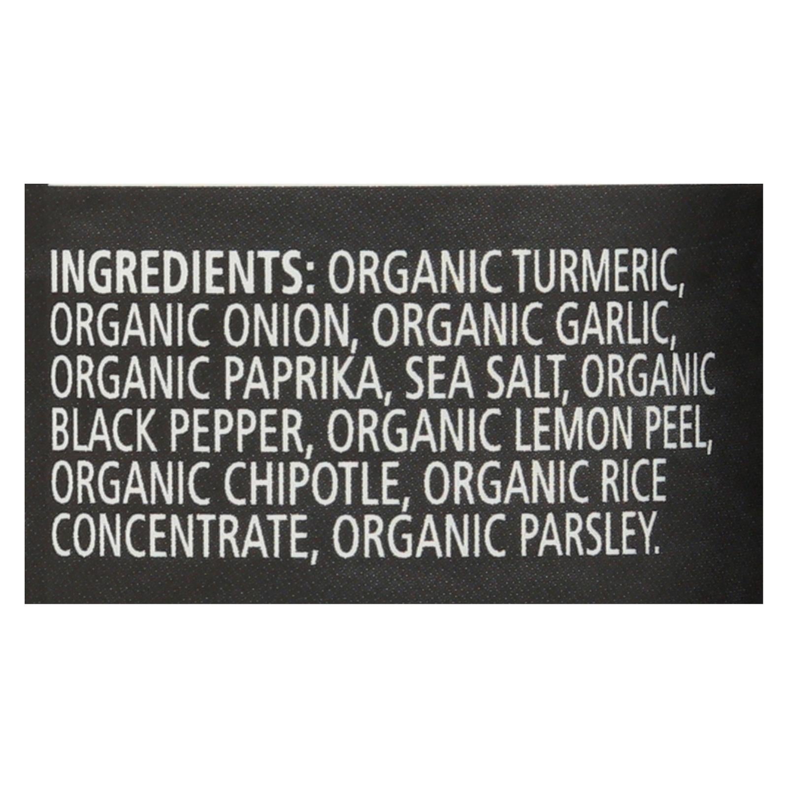 ingredients : organic turmeric;organic onion;organic garlic;organic paprika;sea salt;organic black pepper;organic lemon peel;organic chipotle;organic rice concentrate;organic parsley