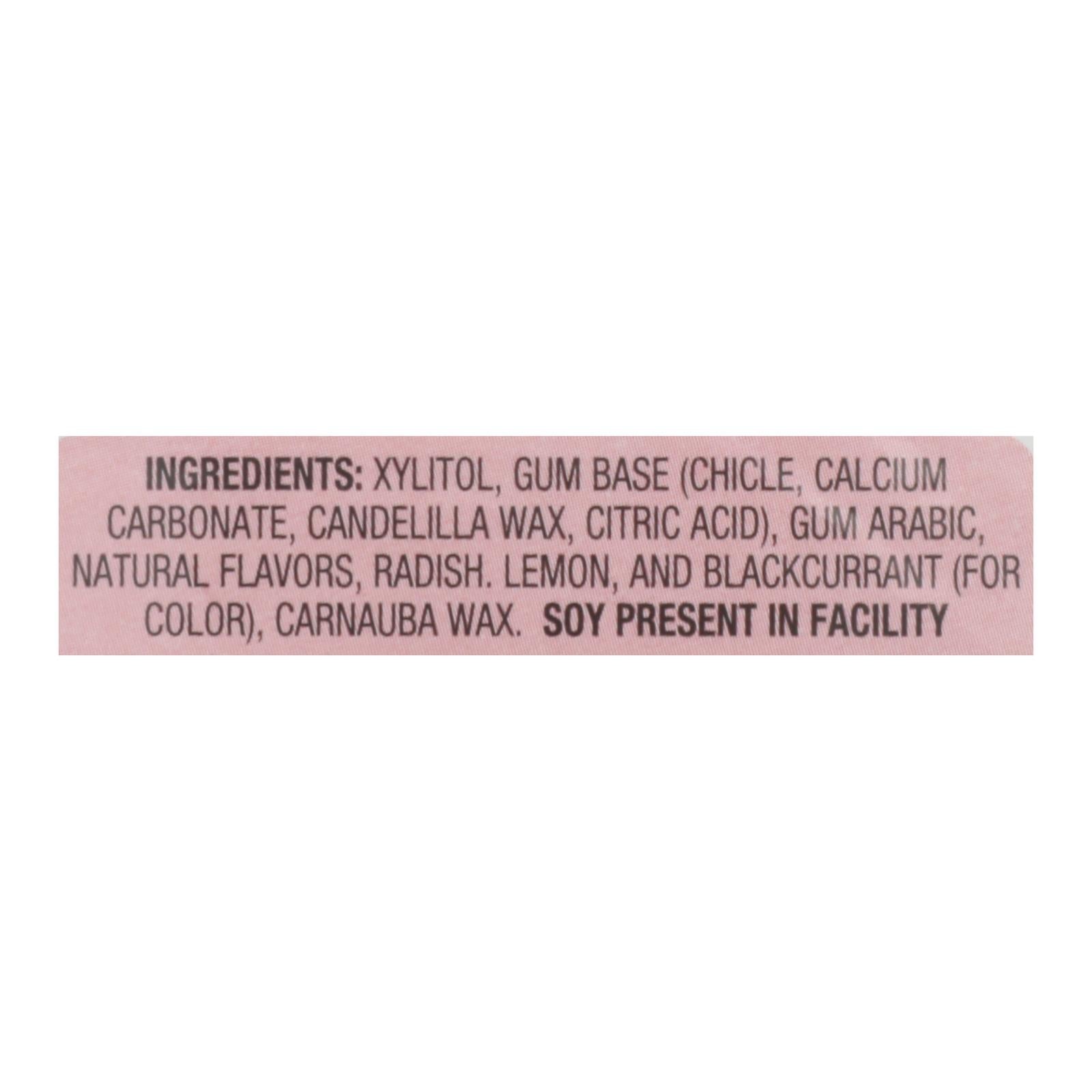 ingredients : xylitol;gum base;chicle;calcium carbonate;candelilla wax;citric acid;gum arabic;natural flavors;radish;lemon;and blackcurrant;for color;carnauba wax