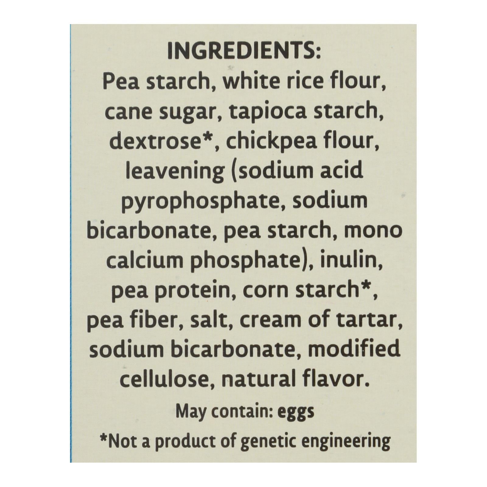 ingredients : pea starch;white rice flour;cane sugar;tapioca starch;dextrose;chickpea flour;leavening (sodium acid pyrophosphate, sodium bicarbonate, pea starch, mono calcium phosphate);inulin;pea protein;corn starch;pea fiber;salt;cream of tartar;sodium bicarbonate;modified cellulose;natural flavor