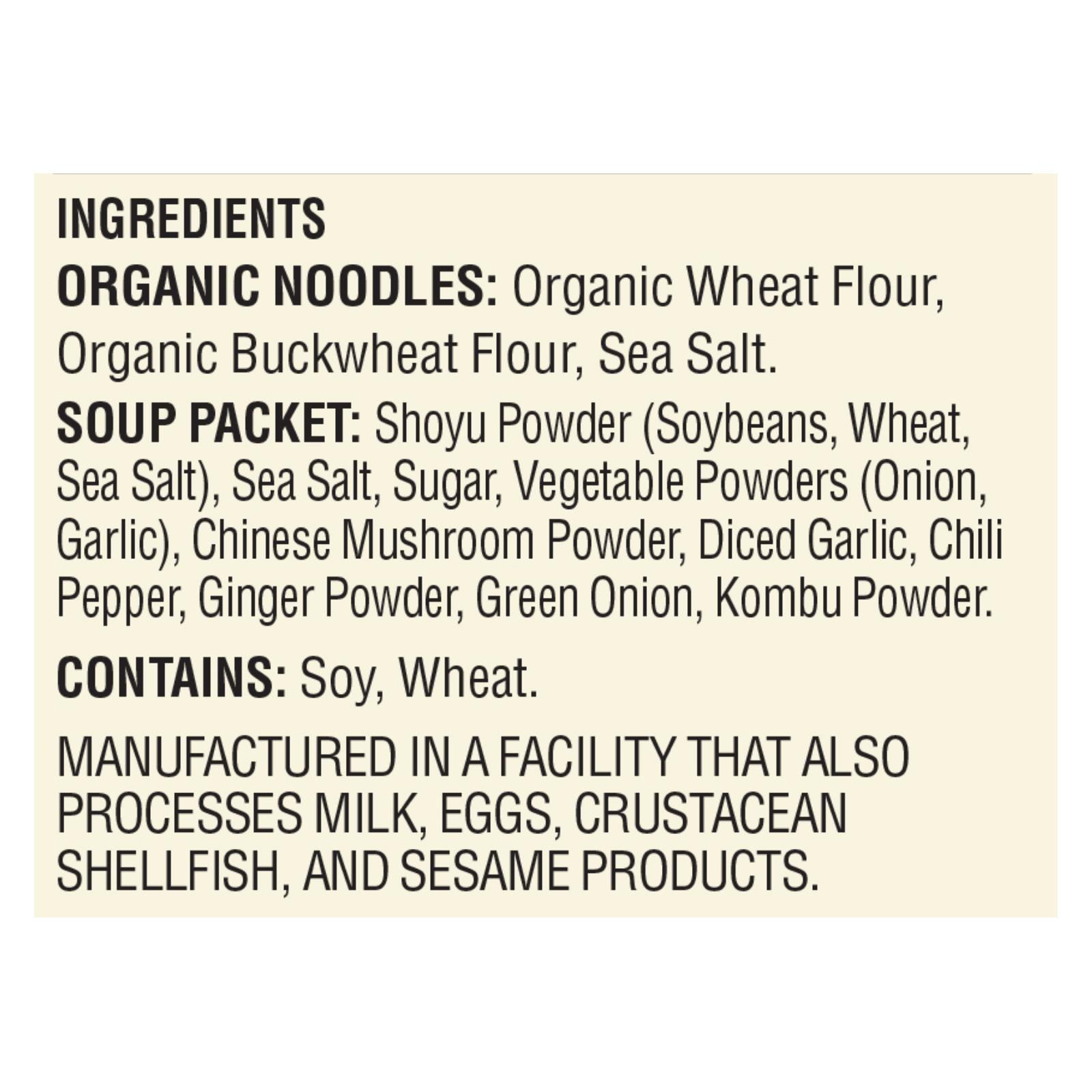 ingredients : organic noodles: organic wheat flour, organic buckwheat flour, sea salt;soup packet: shoyu powder (soybeans, wheat, sea salt), sea salt, sugar, vegetable powders (onion, garlic), chinese mushroom powder, diced garlic, chili pepper, ginger powder, green onion, kombu powder