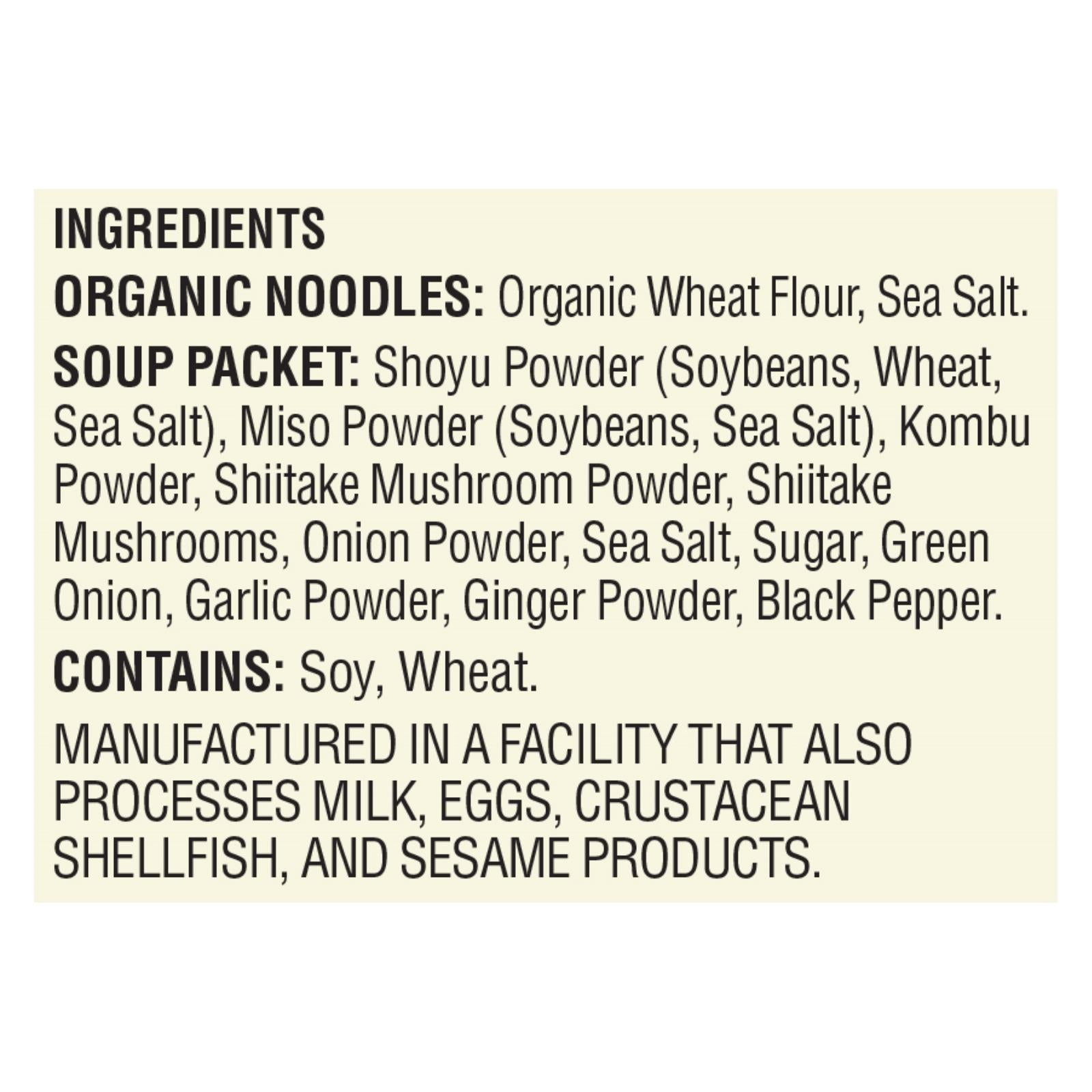 ingredients : organic noodles: organic wheat flour, sea salt;soup packet: shoyu powder (soybeans, wheat, sea salt), miso powder (soybeans, sea salt), kombu powder, shiitake mushroom powder, shiitake mushrooms, onion powder, sea salt, sugar, green onion, garlic pepper, ginger powder, black pepper