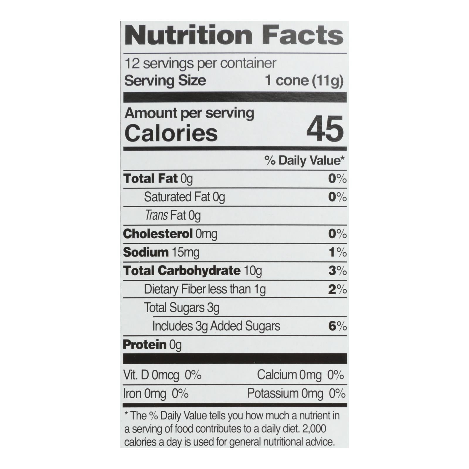 Let's do… gluten free sugar cones are our traditional-style rolled cones that come in a 4.6 oz. Box. Each box has 12 vegan friendly cones that are certified gluten-free. Our sugar cones are non-gmo project verified and orthodox union kosher certified. Each cone has 45 calories and are free of trans fat.