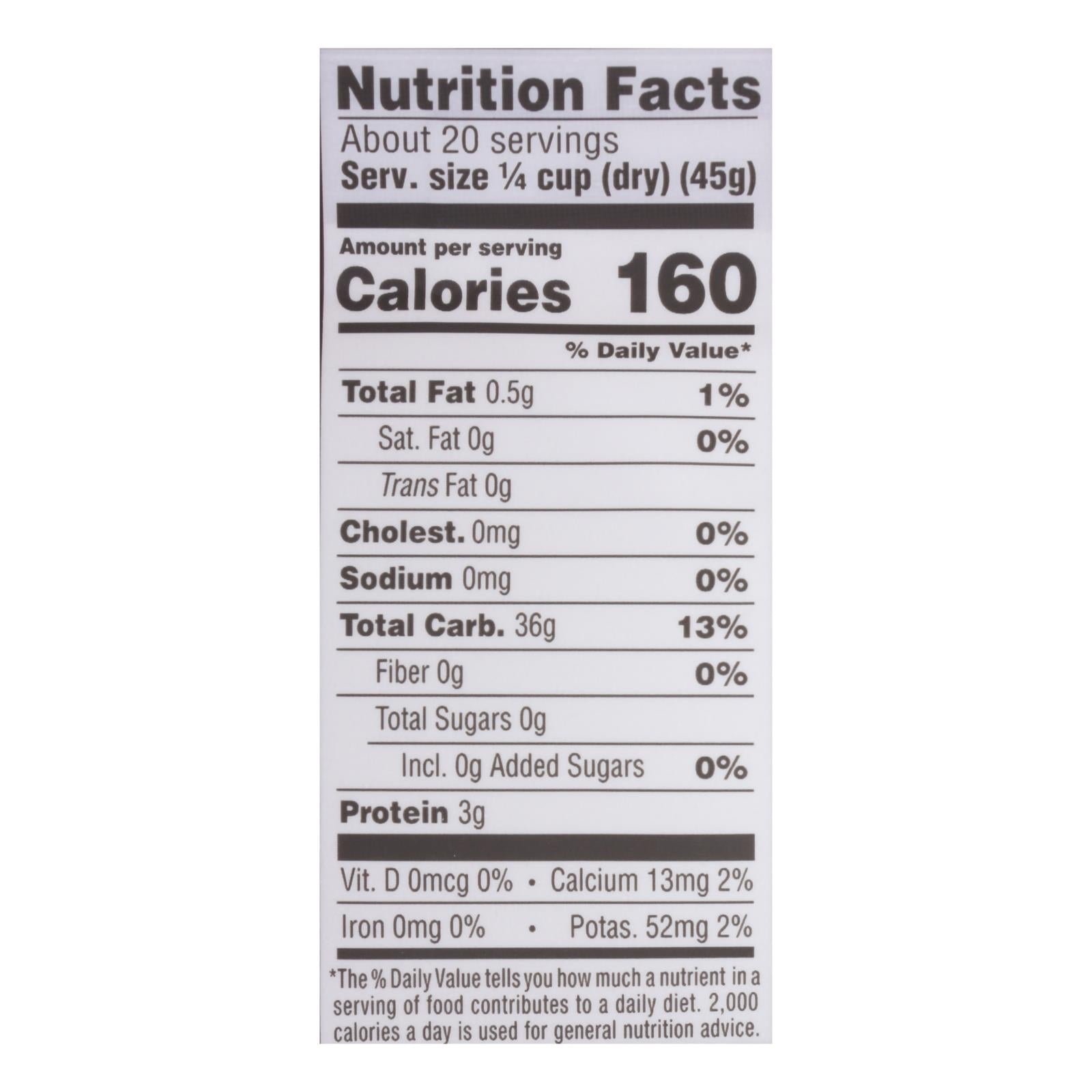 Lundberg family farms california white basmati rice is a natural, non-gmo whole grain. Free from any additives or other substances, this rice is pure and nutrient rich. Lundberg family farms rice is manufactured with renewable energy and sustainable methods. This product is gluten-free, kosher and organic. Each bag of lundberg family farms california white basmati rice weighs 32 oz. With 20 servings per bag and 160 calories per serving. Store in a cool, dry place. See nutrition facts panel for allergens.