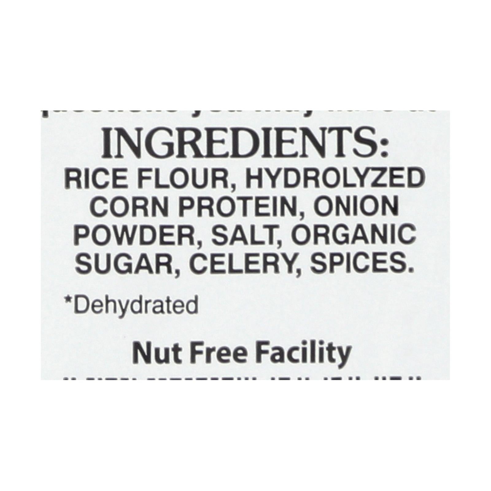 ingredients : rice flour;hydrolyzed corn protein;onion powder;salt;organic sugar;celery;spices