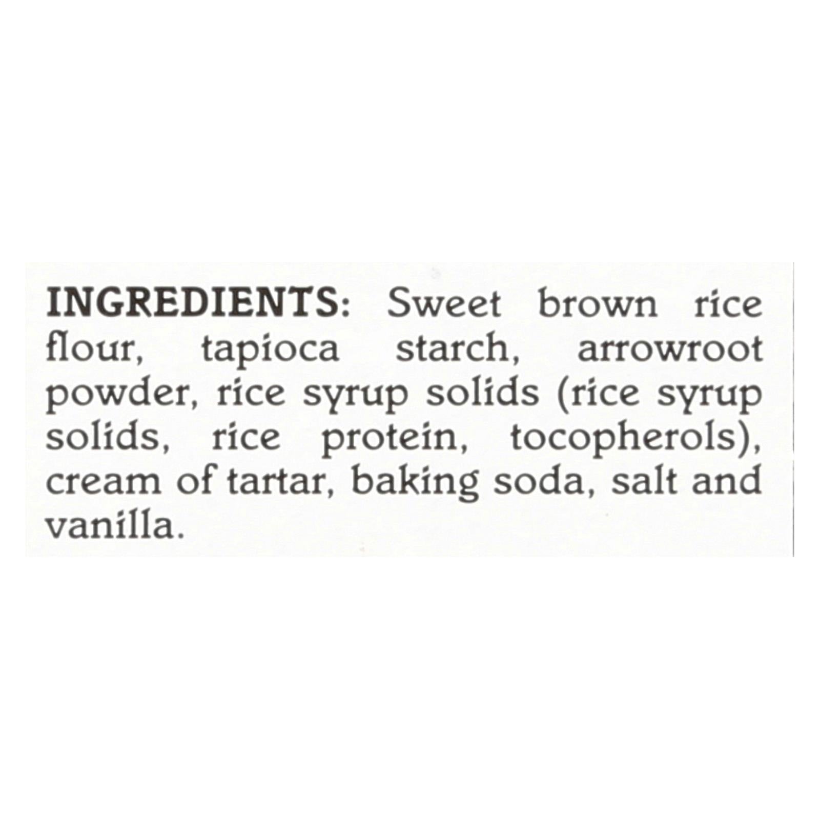 ingredients : brown rice flour (long grain white rice, rice bran);starches (tapioca and/or arrowroot);rice syrup solids (rice protein, natural mixed tocopherols {added to maintain freshness});cream of tartar;baking soda;salt and ground vanilla bean