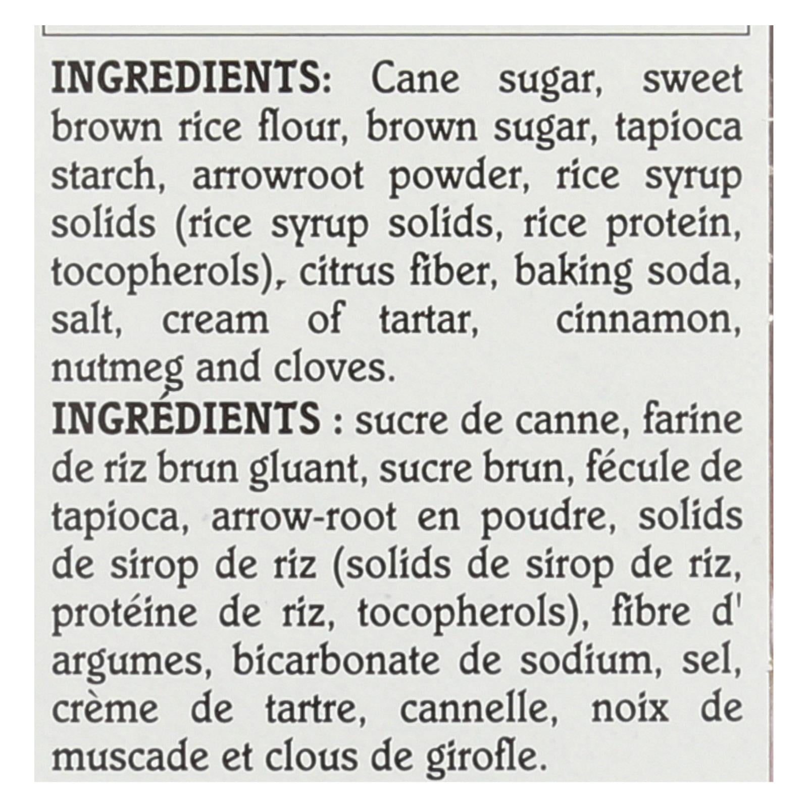 ingredients : cane sugar;brown rice flour (long grain white rice, rice bran);starches (tapioca and/or arrowroot);rice syrup solids (rice protein, natural mixed tocopherols {added to maintain freshness});citrus fiber;baking soda;salt;cream of tartar;cinnamon;nutmeg;cloves