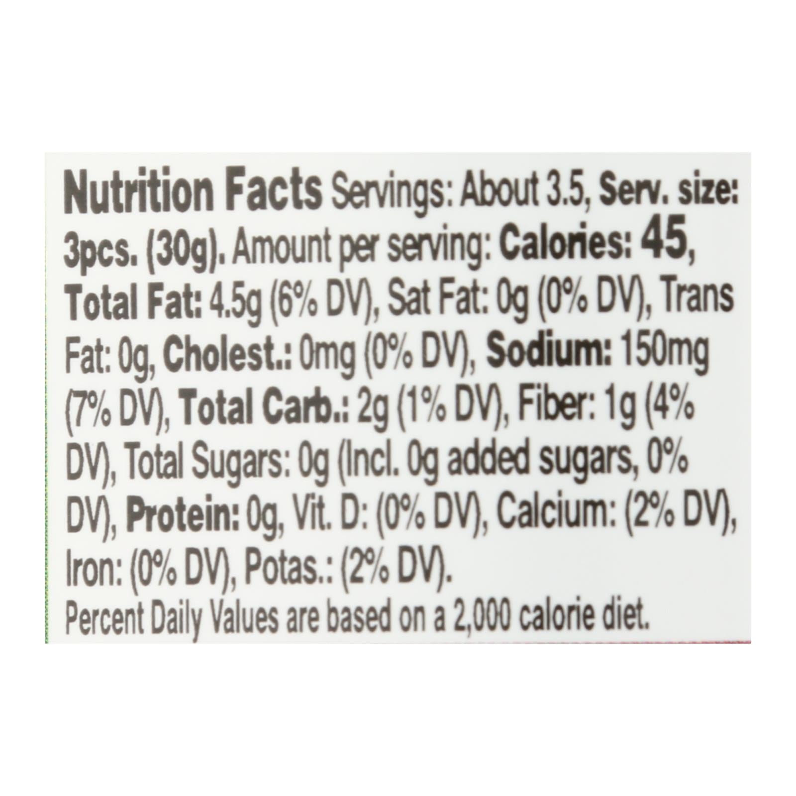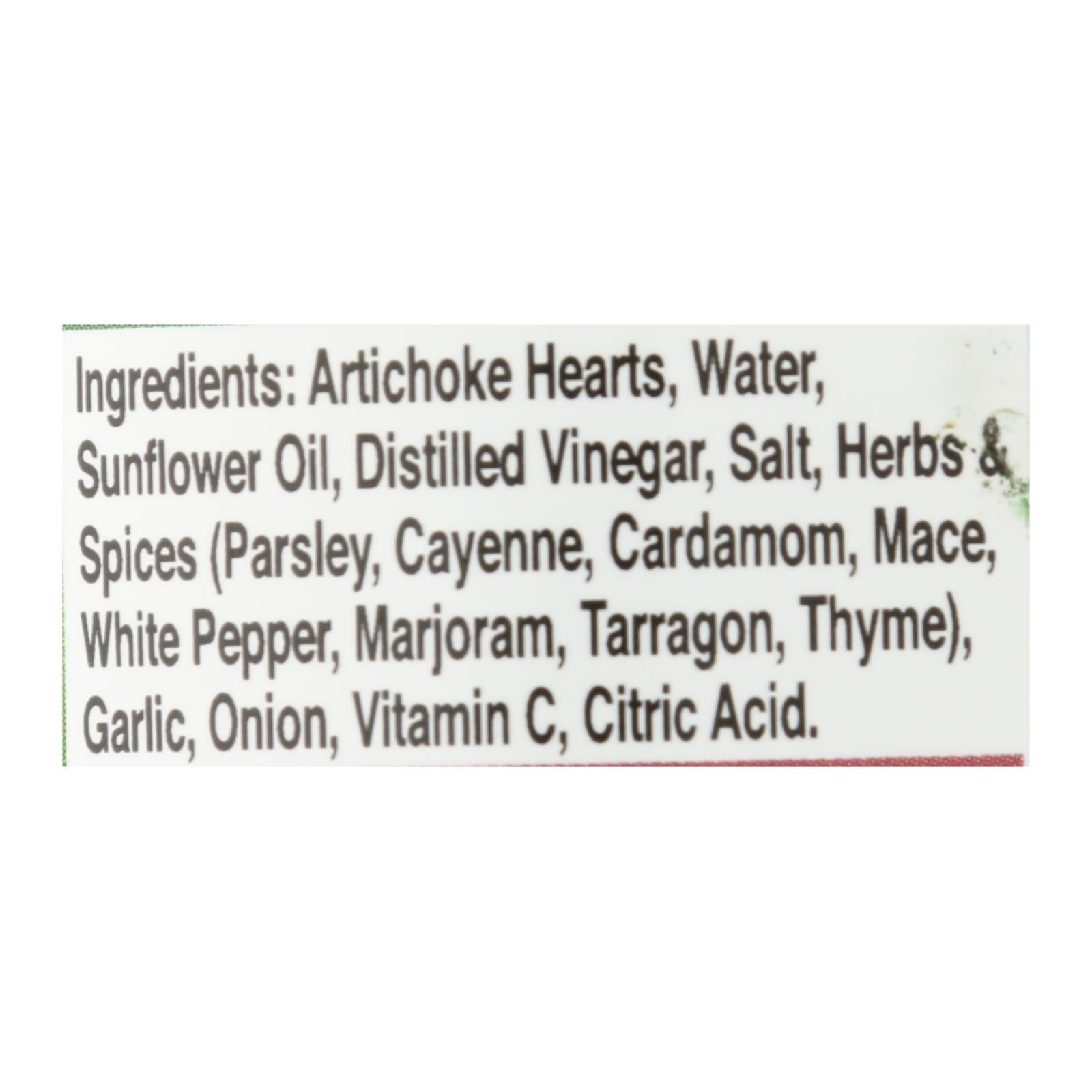 ingredients : artichoke hearts;water;extra-virgin olive oil;vinegar;salt;spices (garlic, parsley, onion, cayenne, ginger, mace, marjoram, cardamom, nutmeg, tarragon, dill, bay leaf, clove, coriander, saffron);citric acid;ascorbic acid