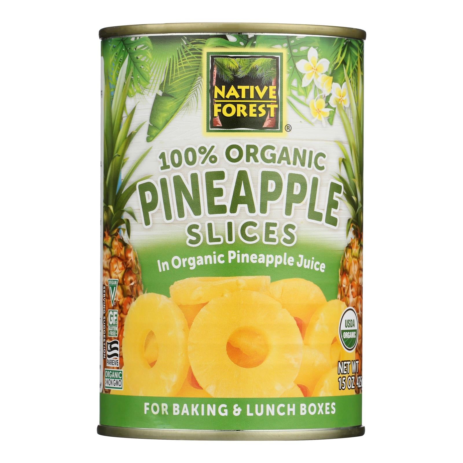 For baking & lunch boxes. Native forest organic pineapples are sustainably grown and packed according to principles of organic agriculture. Organic farms nourish soil, promote biodiversity, provide a premium to farmers and produce some of the tastiest fruit in the world. We select the finest, field-ripened organic pineapples, then cut and pack the fresh fruit in the world. We select the finest, field-ripened organic pineapples, then cut and pack the fresh fruit in its own organic juice. Nothing is added or removed. Your family will love the great taste of native forest organic pineapple: consistently sweet, naturally tart and always delicious. The quality that you taste is a hint of the care behind this and every native forest product. A family owned vegetarian company since 1978. Convenience without compromise.