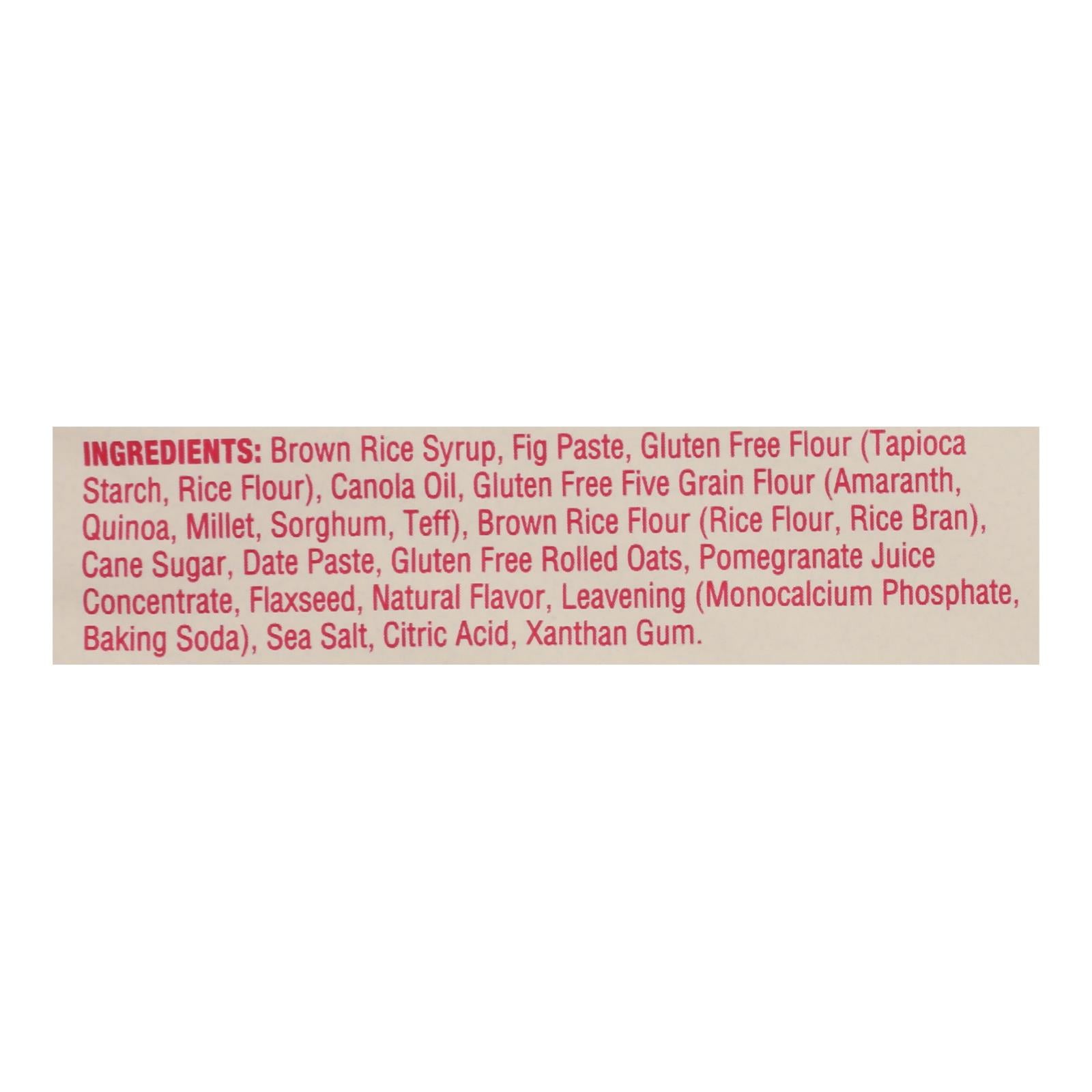 ingredients : brown rice syrup;fig paste;gluten free flour (tapioca starch, rice flour);canola oil;gluten free five grain flour (amaranth, quinoa, millet, sorghum, teff);brown rice flour (rice flour, rice bran);cane sugar;date paste;gluten free rolled oats;pomegranate juice concentrate;flaxseed;natural flavor;leavening (monocalcium phosphate, baking soda);sea salt;citric acid;xanthan gum