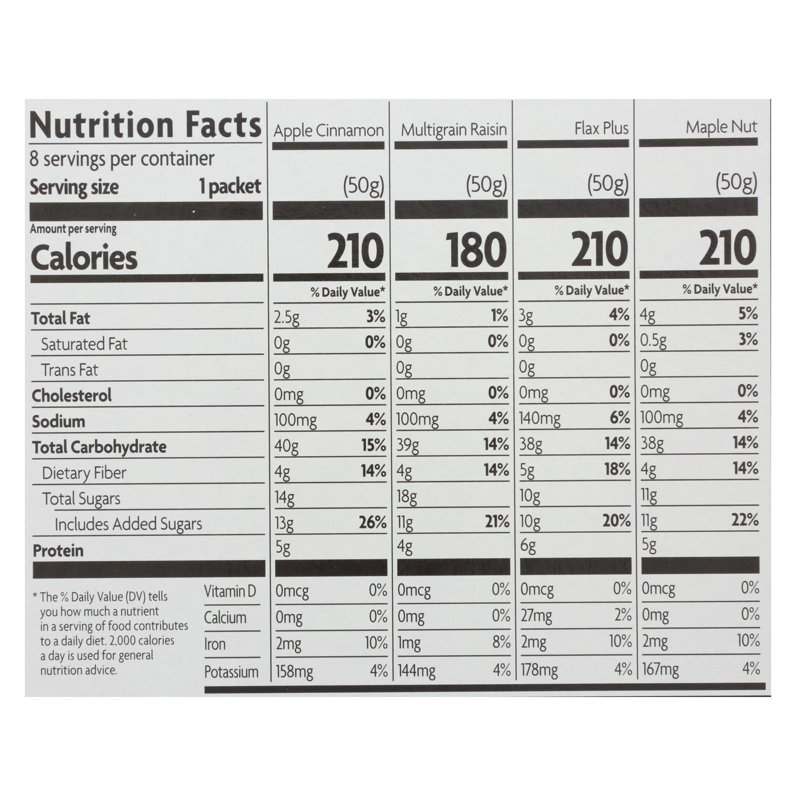 ingredients : apple cinnamon: whole grain rolled oats*, cane sugar*, dried apple*, cinnamon*, sea salt, apple flavor;flax plus®: whole grain rolled oats*, cane sugar*, flax seeds*, sea salt;maple nut: whole grain rolled oats*, cane sugar*, pecans*, sea salt, maple sugar*, maple flavor;multigrain raisin: whole grain rolled oats*, wheat flakes*, cane sugar*, raisins* (coated with sunflower oil*), cinnamon*, sea salt