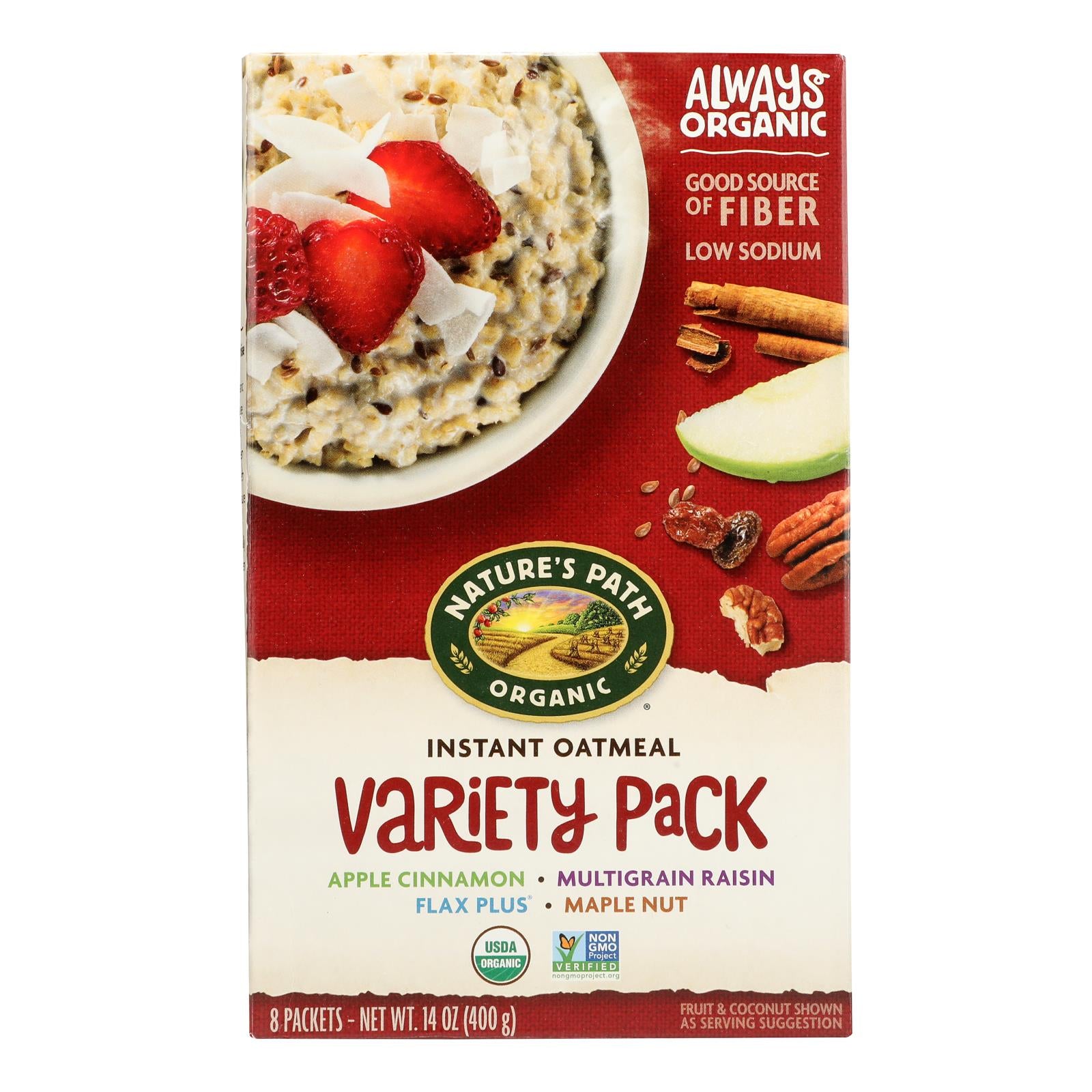 Nature's path hot oatmeal variety pack of 8 is made with organic ingredients and is high in fiber. This variety pack provides a box of 2 packets each of apple cinnamon, multigrain raisin, flax plus and maple nut, containing whole grains, protein and fiber. Our hot oatmeal is made with kosher ingredients that are gmo-free and vegan. We use usda organic certified grains. See nutrition facts panel for allergens.