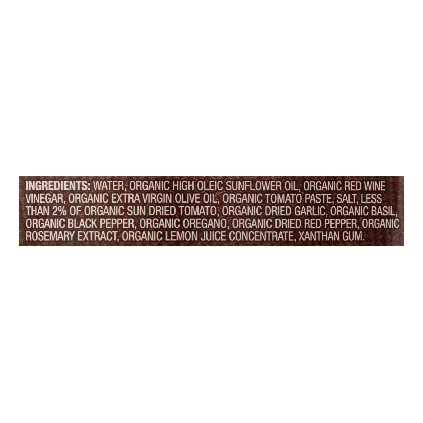 ingredients : water;organic high oleic sunflower oil;organic red wine vinegar;organic extra virgin olive oil;organic tomato paste;salt;less than 2% of organic sun dried tomato;organic dried garlic;organic basil;organic black pepper;organic oregano;organic dried red pepper;organic rosemary extract;organic lemon juice concentrate;xanthan gum