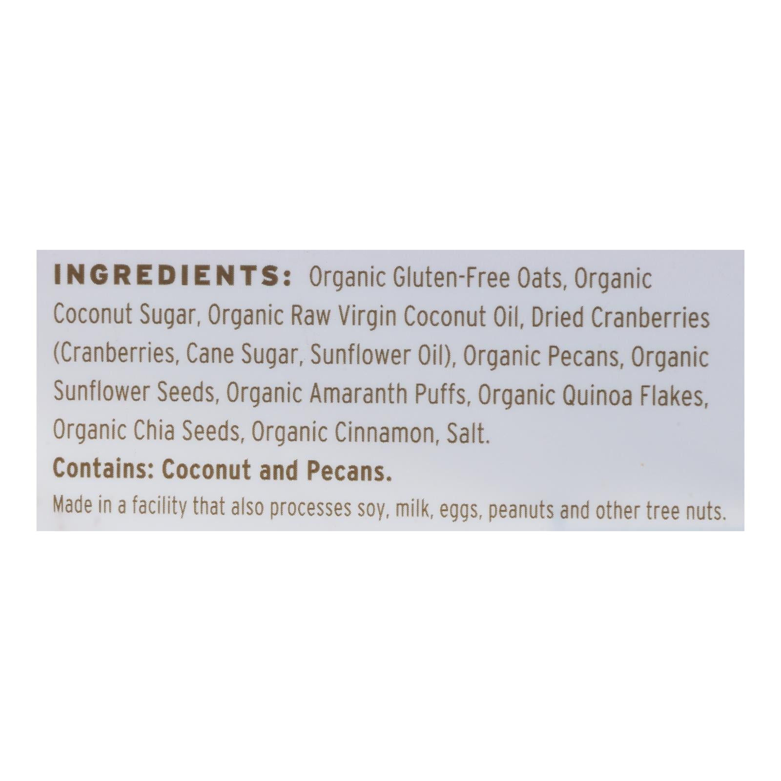 ingredients : organic certified gluten-free oats;organic coconut sugar;organic coconut oil;dried cranberries (cranberries, cane sugar, sunflower oil);organic pecans;organic sunflower seeds;organic amaranth puffs;organic quinoa flakes;organic chia seeds;organic cinnamon;sea salt