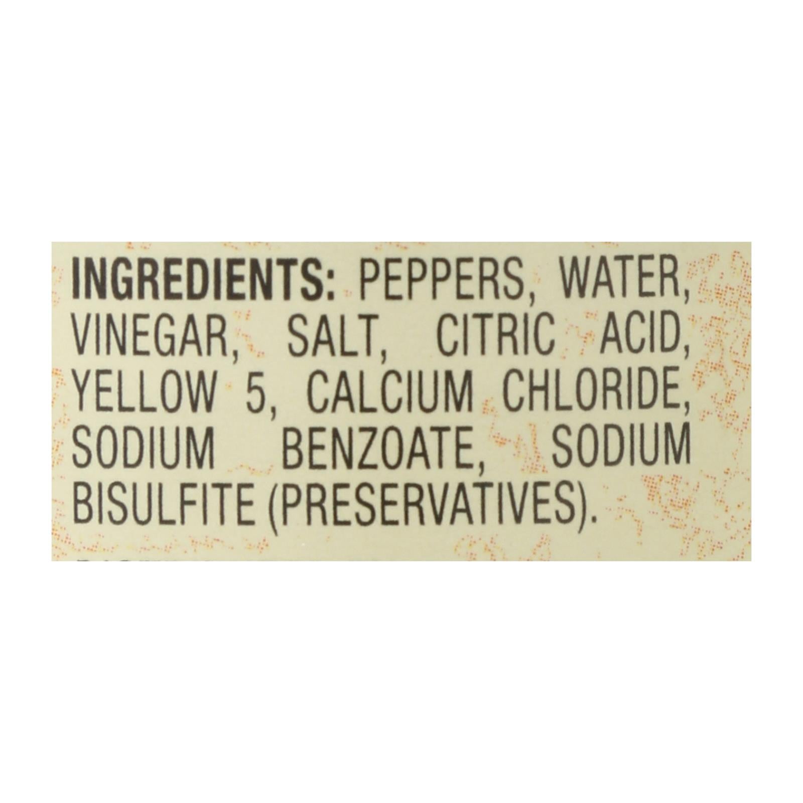 ingredients : peppers;water;vinegar;salt;citric acid;yellow 5;calcium chloride;sodium benzoate;sodium bisulfite (preservatives)
