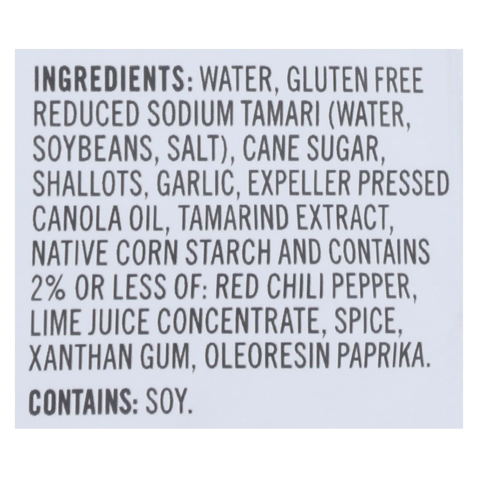 ingredients : water;gluten free reduced sodium tamari (water, soybeans, salt);cane sugar;shallots;garlic;expeller pressed canola oil;tamarind extract;native corn starch and contains 2% or less of: red chili pepper, lime juice concentrate, spice, xanthan gum, oleoresin paprika