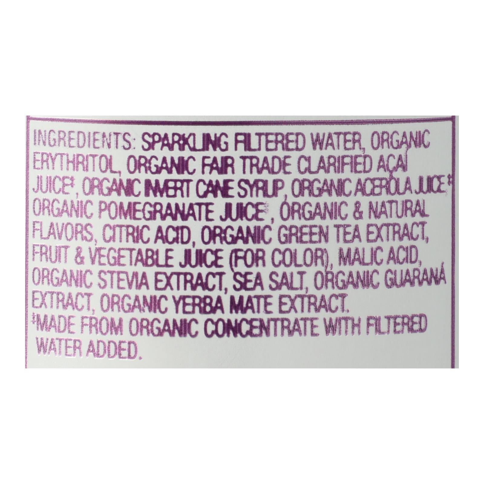 ingredients : sparkling filtered water;organic erythritol;organic fair trade certified clarified acai juice‡;organic invert cane syrup;organic acerola juice;organic pomegranate juice‡;organic & natural flavors;citric acid;organic green tea extract;fruit & vegetable juice (for color);malic acid;organic stevia extract;sea salt;organic guarana extract;organic yerba mate extract