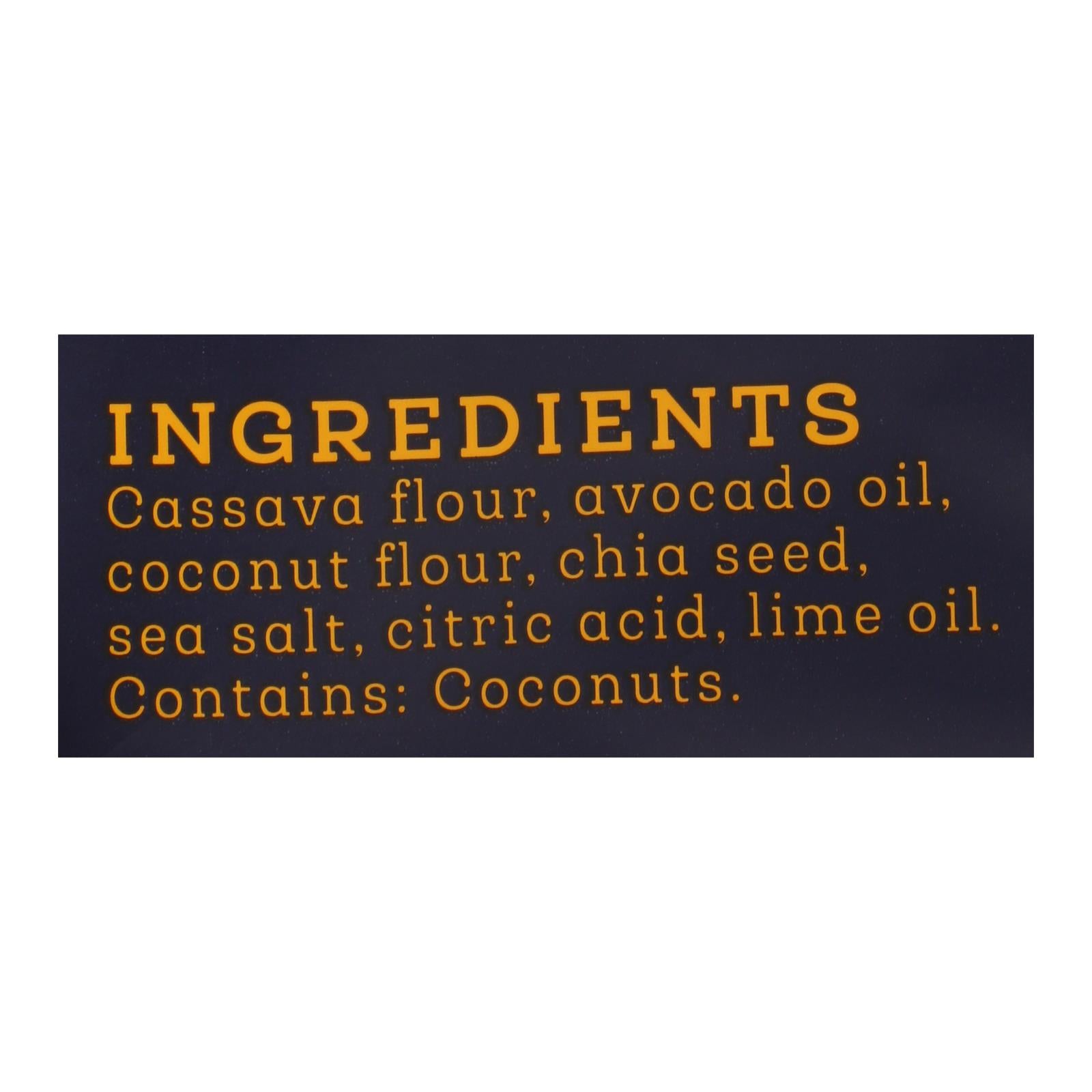 ingredients : cassava blend (cassava flour, cassava starch);avocado oil;coconut flour;chia seed;sea salt;citric acid;lime oil