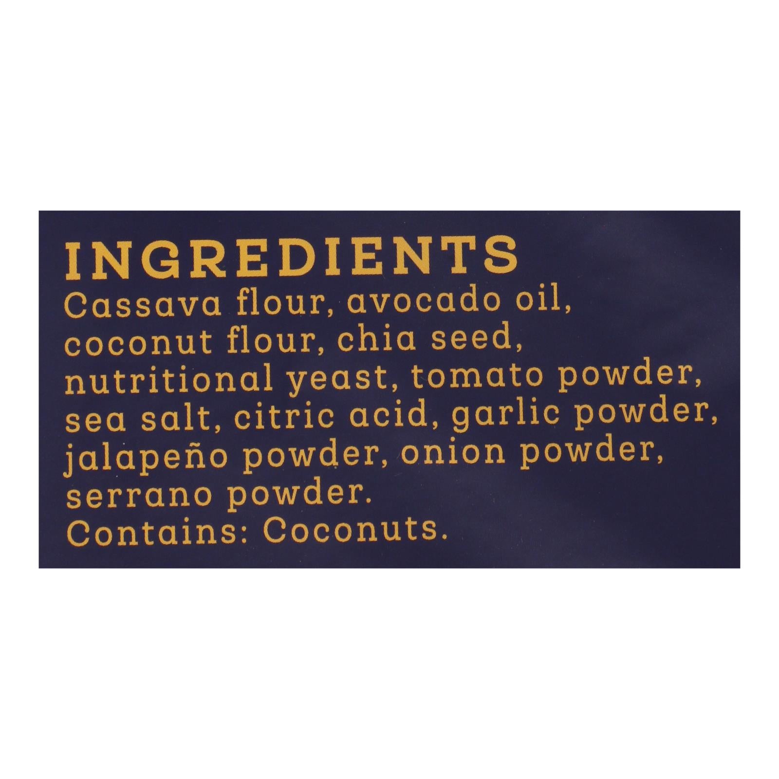 ingredients : cassava blend (cassava flour, cassava starch);avocado oil;coconut flour;nutritional yeast;tomato powder;chia seed;sea salt;citric acid;garlic powder;jalapeno powder;onion powder;serrano powder