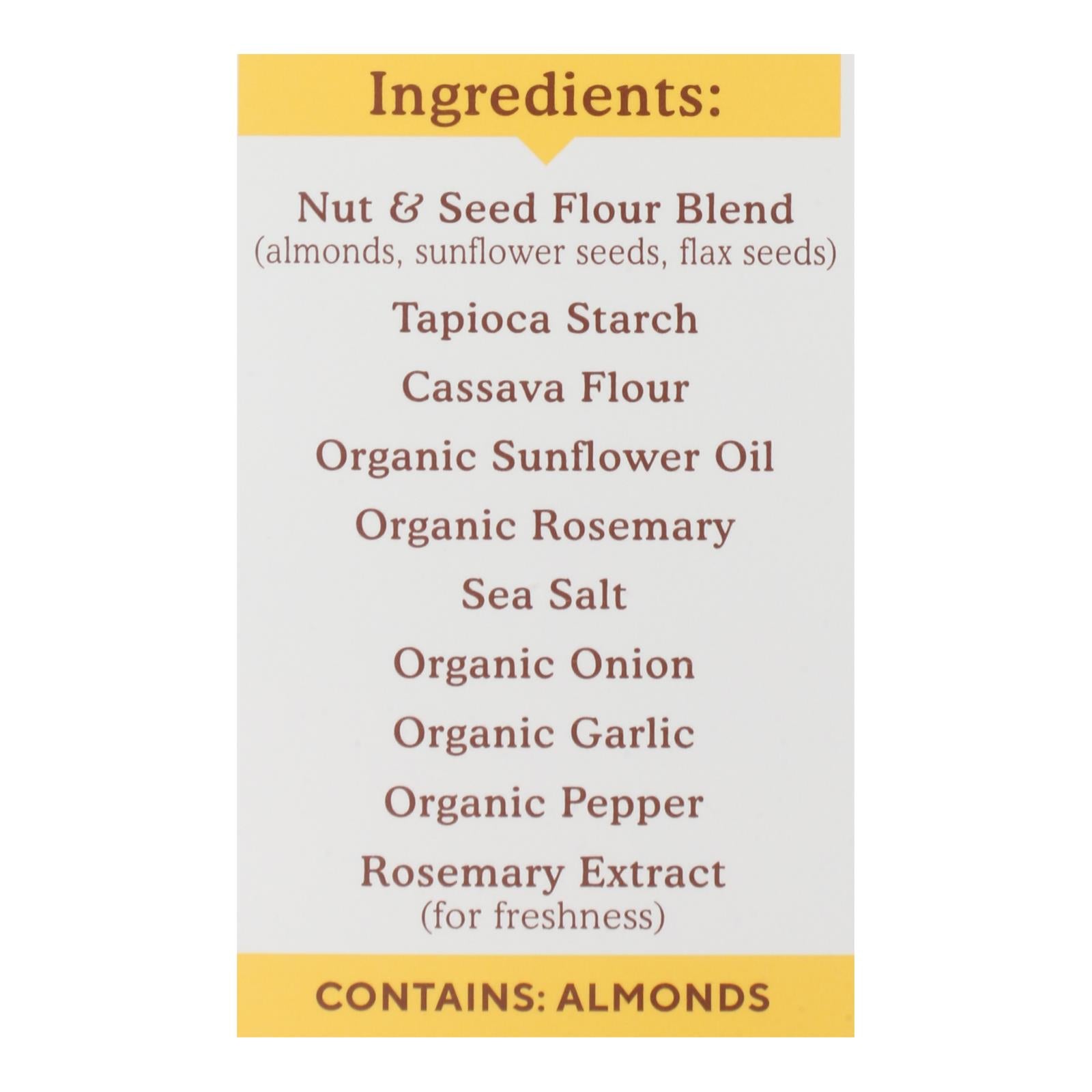 ingredients : nut & seed flour blend (almonds, sunflower seeds, flax seeds) tapioca starch cassava flour organic sunflower oil sea salt organic rosemary organic onion organic garlic organic pepper rosemary extract (for freshness)