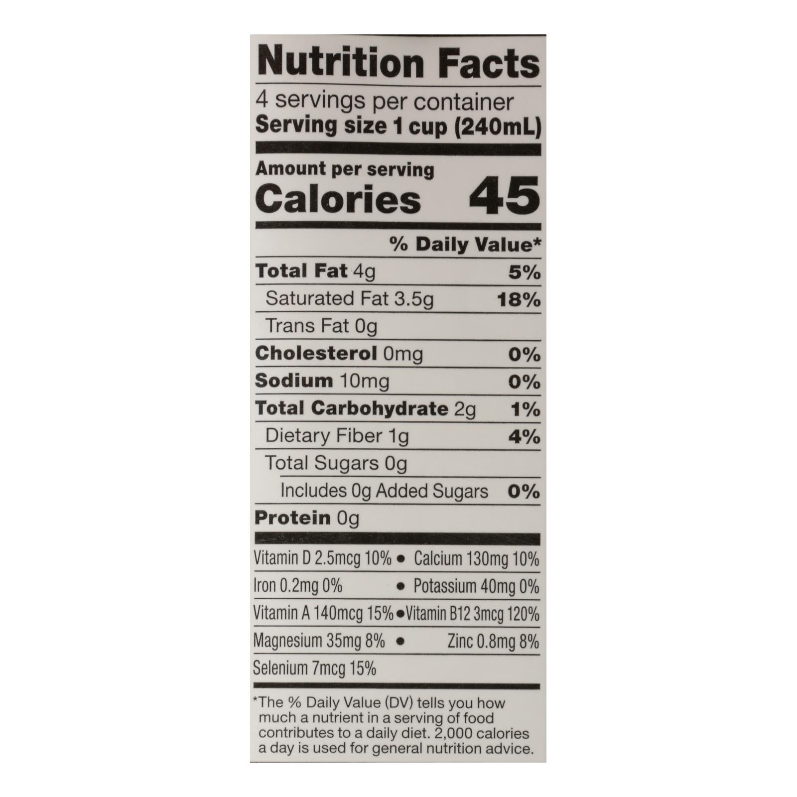 So delicious original coconut milk is a 100% usda-certified organic beverage. This unsweetened, gluten-free coconut milk comes in one 1 qt. Carton and contains 0 g. Of trans fat or cholesterol. It is certified kosher-parve and certified vegan, and each serving contains just 45 calories. See nutrition facts panel for allergens.