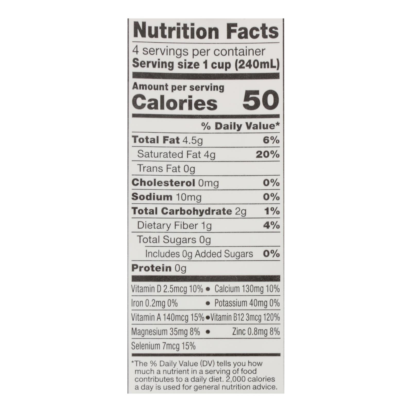 ingredients : organic coconutmilk (filtered water, organic coconut cream);organic guar gum;vitamin and mineral blend (calcium phosphate, magnesium phosphate, calcium carbonate, l-selenomethionine [selenium], vitamin a acetate, vitamin d2, zinc oxide, vitamin b12);natural flavor;xanthan gum