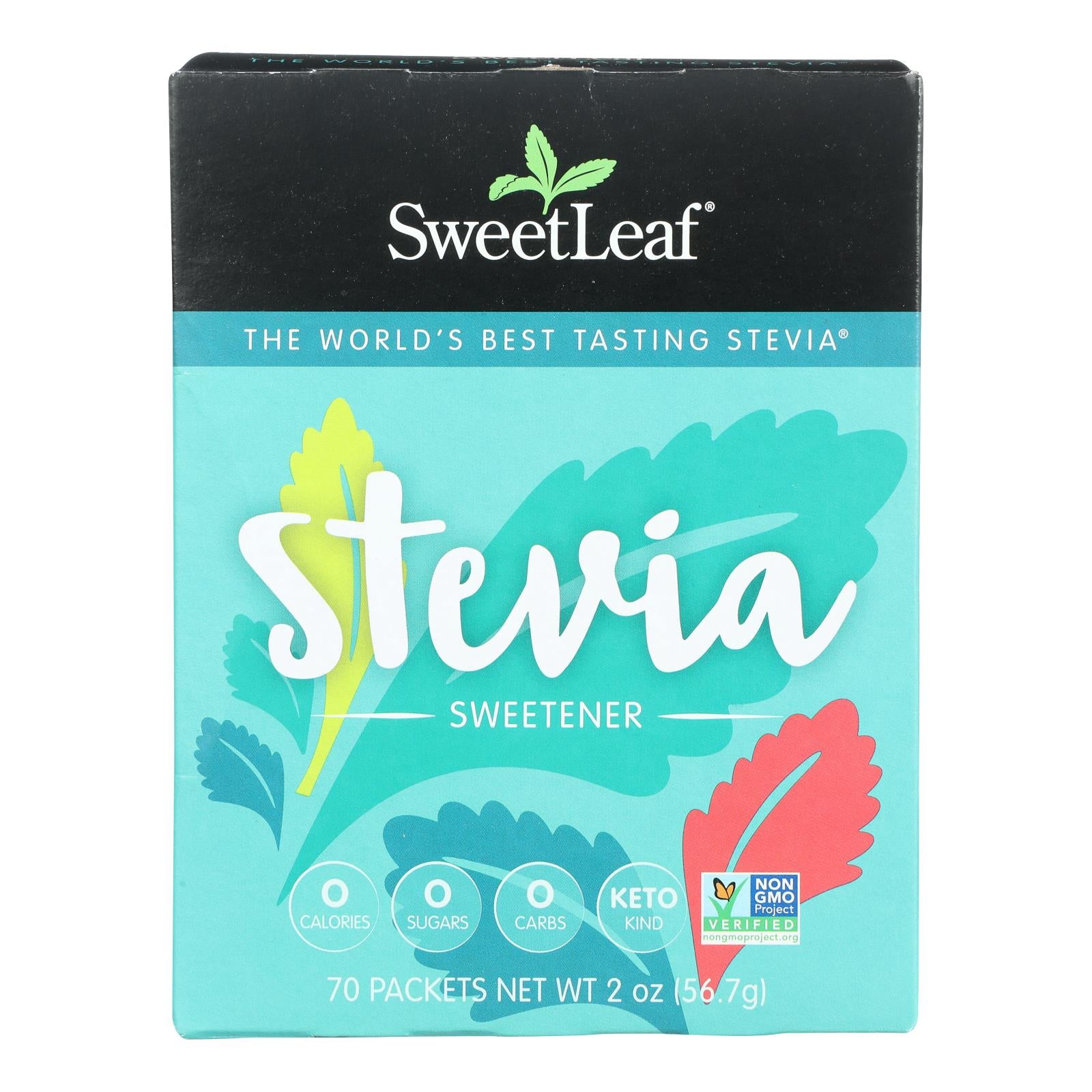 Sweetleaf sweetener 70 count box contains 70 sweetener packets that offer zero calories, zero carbs, and a non-glycemic response. These natural sweeteners in a 2.5 oz. Box are gluten-free, kosher-parve, non-gmo and all-natural. The ingredients include high-grade stevia leaves and purified water. You'll experience no bitterness or aftertaste.