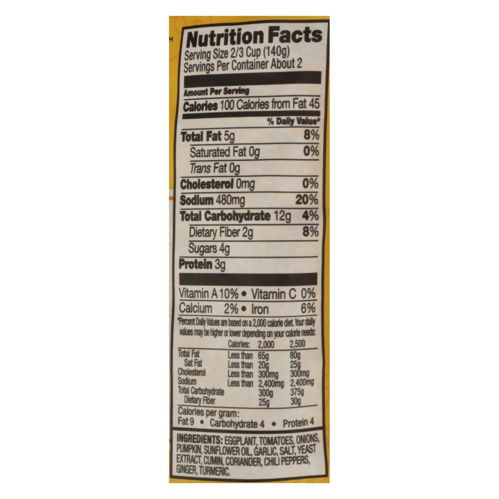 ingredients : eggplant;tomatoes;onions;pumpkin;sunflower oil;garlic;salt;yeast extract;cumin;coriander;chili peppers;ginger;turmeric
