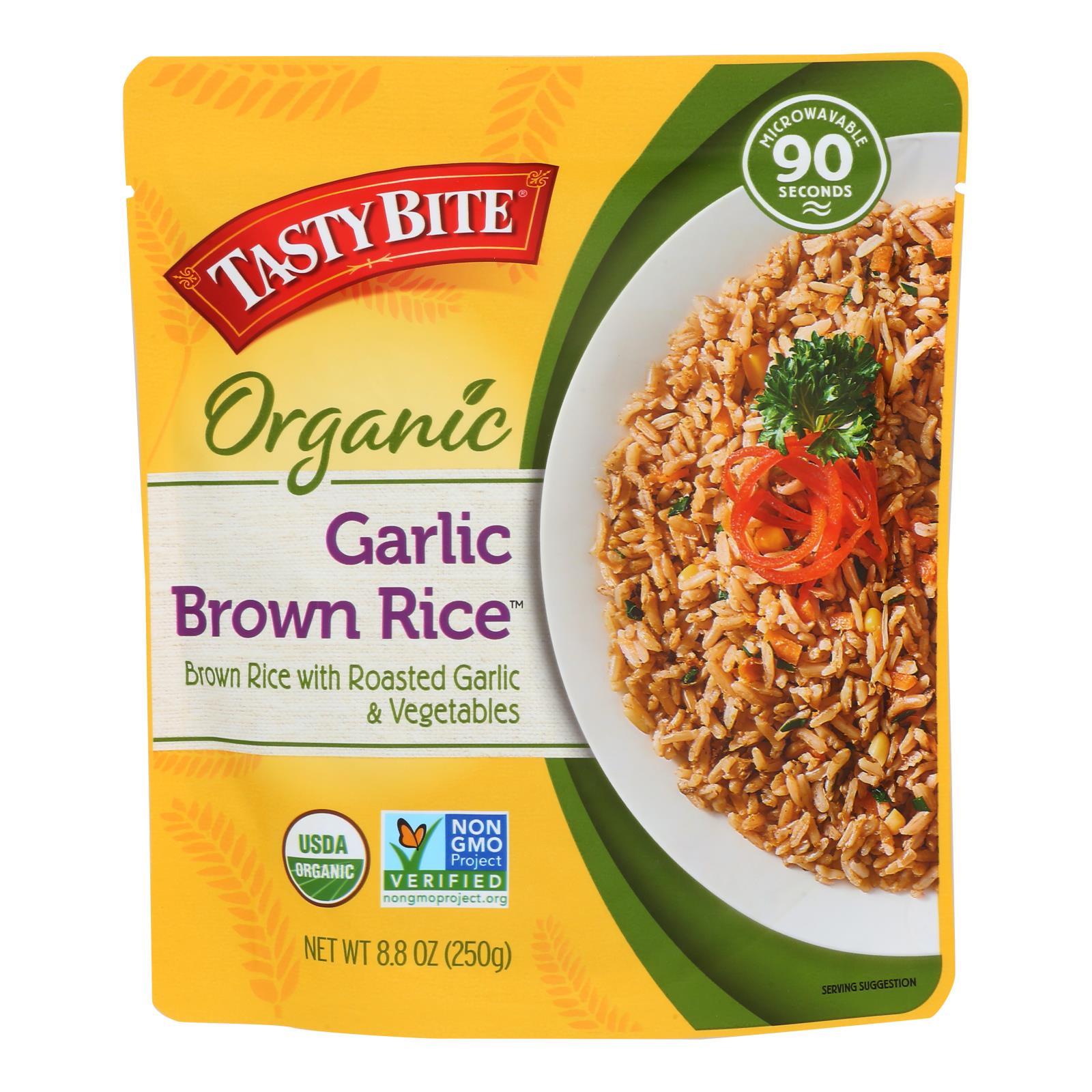 Tasty bite ready to eat garlic brown rice is a microwavable pouch of organic whole grain rice tossed with roasted garlic, corn and fresh vegetables. Each 8.8 oz. Pouch is kosher, vegan, non-gmo, all natural, artificial preservative-free and msg-free. There are two servings per pouch. Our garlic brown rice contains 220 calories per serving with 5 g. Of protein and 2 g. Of fiber.
