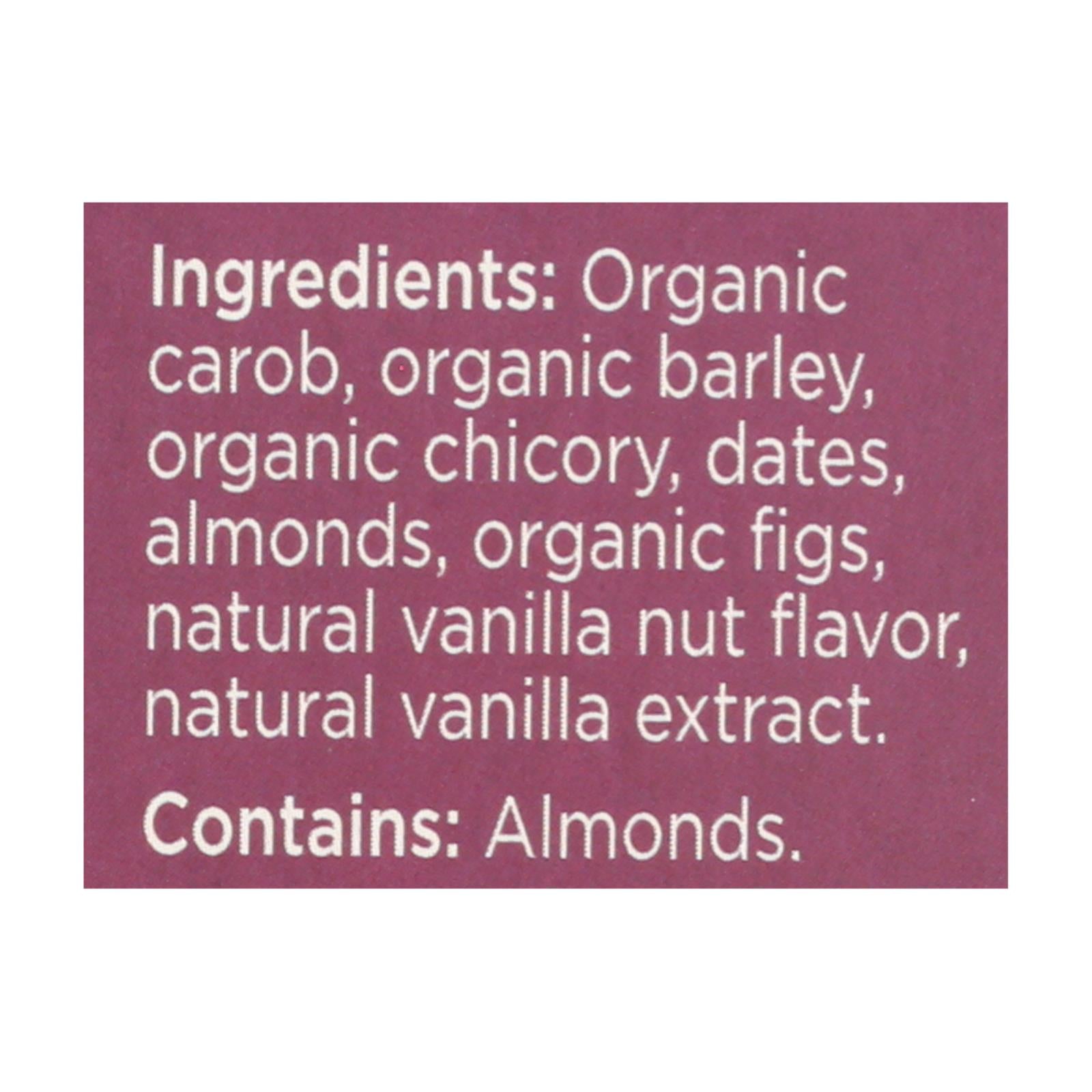 ingredients : organic carob;organic barley;organic chicory;dates;almonds;organic figs;natural vanilla nut flavor;natural vanilla extract