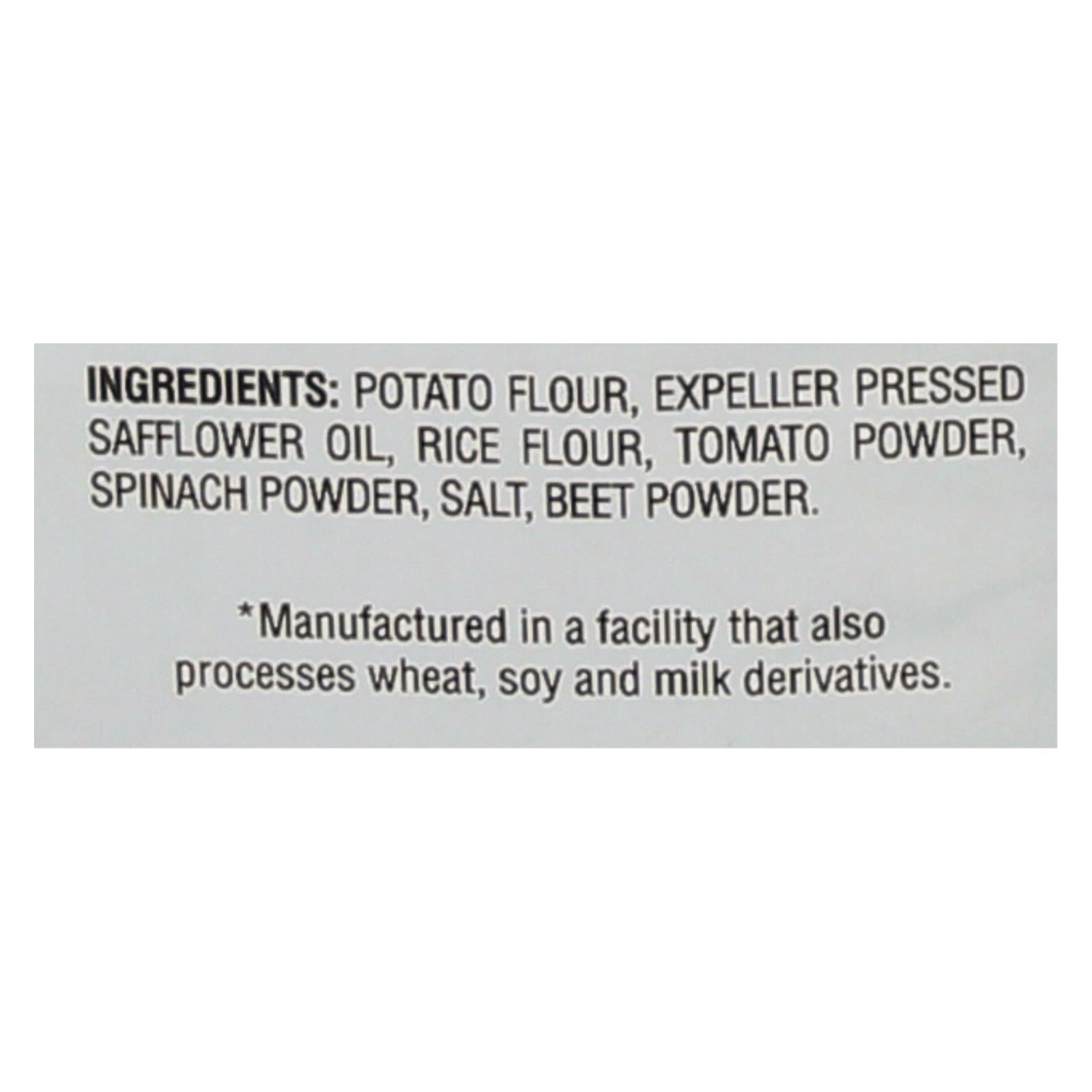 ingredients : potato flour;expeller pressed safflower oil;rice flour;tomato powder;spinach powder;salt;beet powder