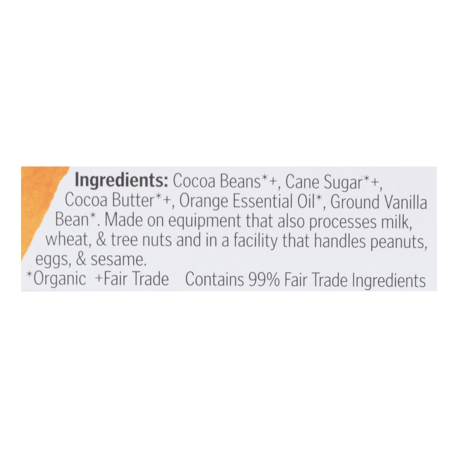 ingredients : cocoa beans* +;cane sugar* +;cocoa butter* +;orange essential oil;ground vanilla bean