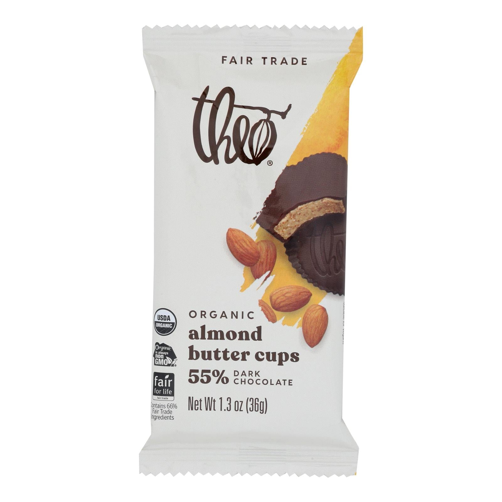 Theo chocolate salted almond butter cups with dark chocolate are usda-certified organic and non-gmo project verified. Each 1.3 oz. Packet contains a single serving of 2 pieces. Our almond butter cups are kosher and vegan for those with dietary restrictions. They are also fair trade, so you can feel good about what you're eating. See nutrition facts panel for allergens.
