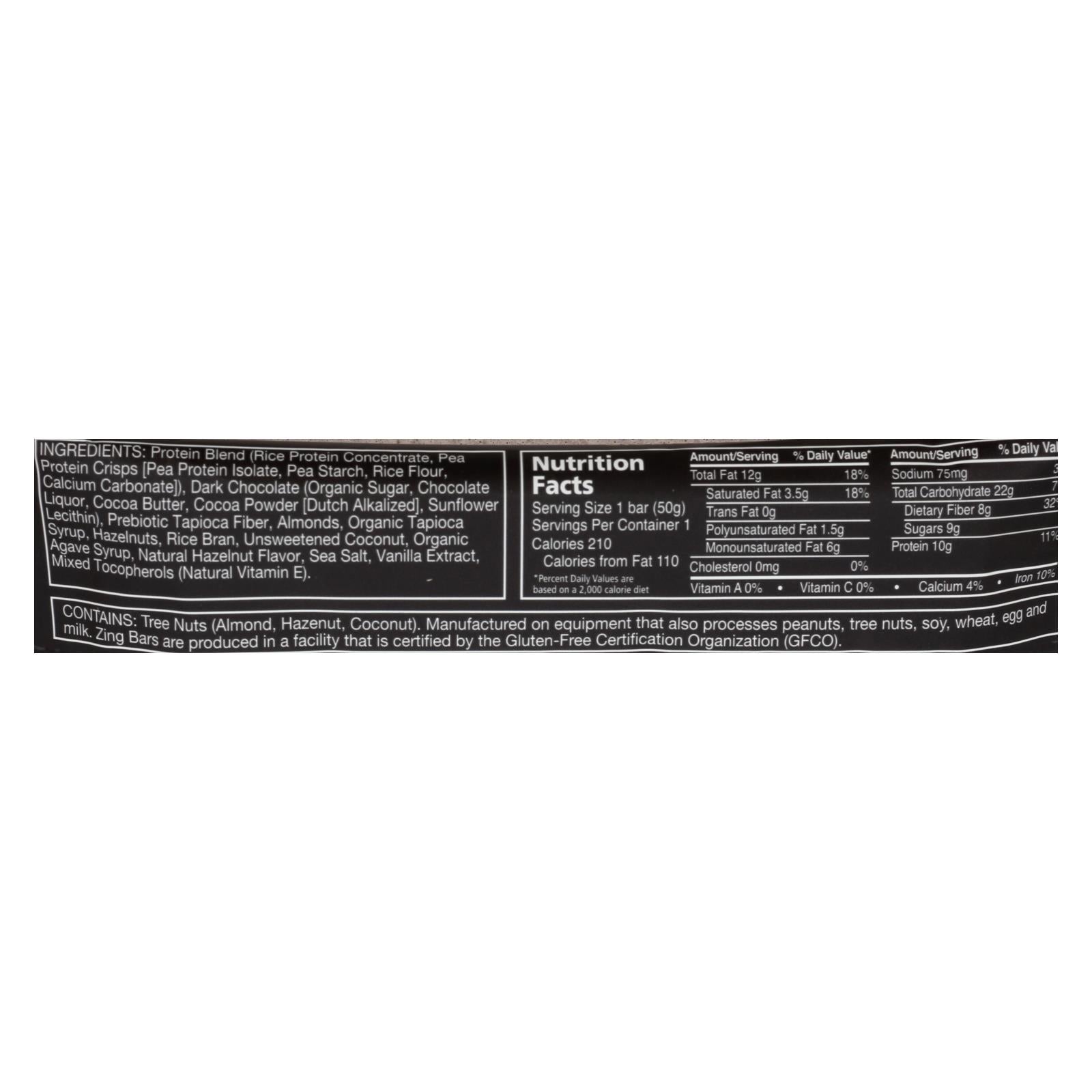 Zing dark chocolate hazelnut nutrition bar is coated in real dark chocolate and offering 10 g. Of protein in this 1.76 oz. Snack. It's kosher, gluten-free and non-gmo. Ingredients include dark chocolate made with organic sugar, hazelnuts, almonds, unsweetened coconut and natural hazelnut flavor. See nutrition facts panel for allergens.